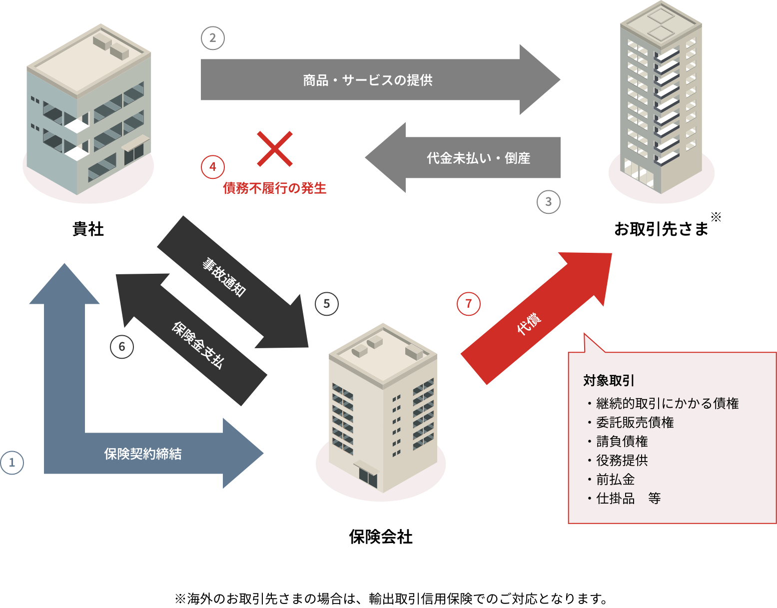 貴社のお取引先さまが倒産または一定の支払遅延等が発生し、損害を被った場合に補償される保険です。また、補償機能以外に一定の与信管理機能もございます。例えば、保険会社による審査や継続的なモニタリングの仕組みは貴社与信管理についての情報収集をサポートするツールとして機能いたします。